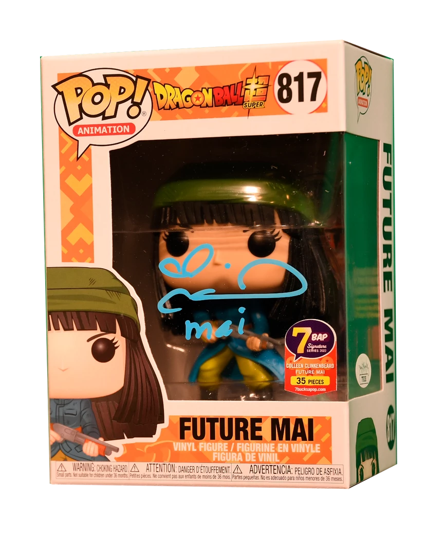 From the DragonballΒ anime and comic series comes this Future Mai Pop! Vinyl Figure!Β This is a limited editionΒ variant of the figure that has been signed by voice actress Colleen Clinkenbeard inΒ blue ink and has been JSA Authenticated.Β Β Limited edition – one ofΒ 35 pieces.