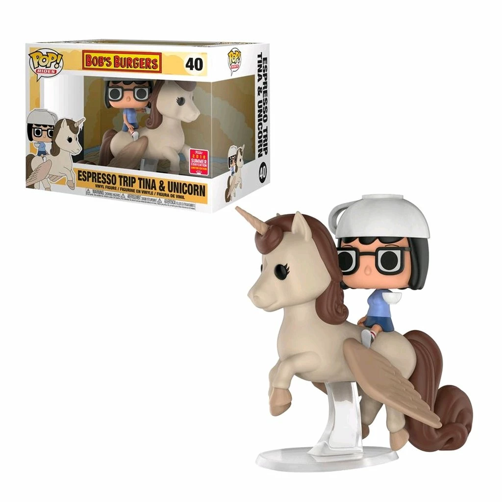 From the Bob’s Burgers TV Cartoon series comes this Espresso Trip Tina riding a unicorn Pop! ride Figure from Funko! This is a San Diego Comic Con shared exclusive, limited-edition release figure.
