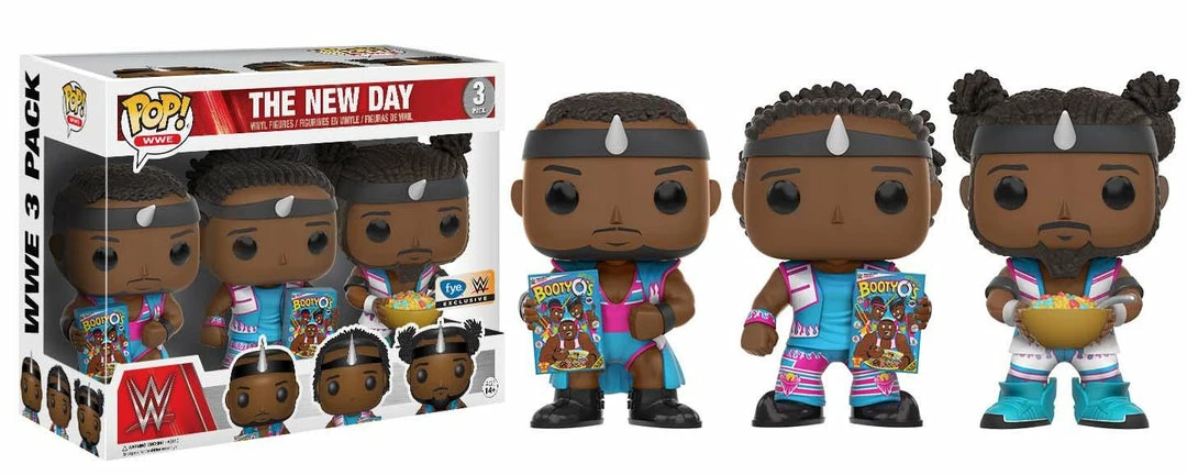 From the WWE comes this New DayΒ 3-pack ofΒ Pop! Vinyl Figures from Funko! This is a limited edition, exclusive version of Xavier Woods, Big E, and Kofi KingstonΒ in their sky blue tights WITH BOOTY-O’s.Β Β